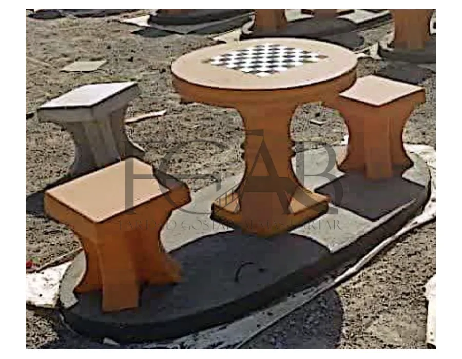 میز شطرنج بتنی با استفاده از بتن الیافی یا بتن مسلح با میلگردهای فولادی ساخته میشود تا در برابر فشار و ضربه مقاومت کامل داشته باشد. سطح میز معمولاً با رنگ اپوکسی یا سنگ مصنوعی پوشش داده میشود تا علاوه بر زیبایی، سطحی صاف و بادوام برای بازی ایجاد کند. پایههای بتنی میز نیز به گونهای طراحی میشوند که پایداری کامل در محیطهای روباز داشته باشد و حتی در صورت وزش باد شدید یا برخورد تصادفی، واژگون نشود.